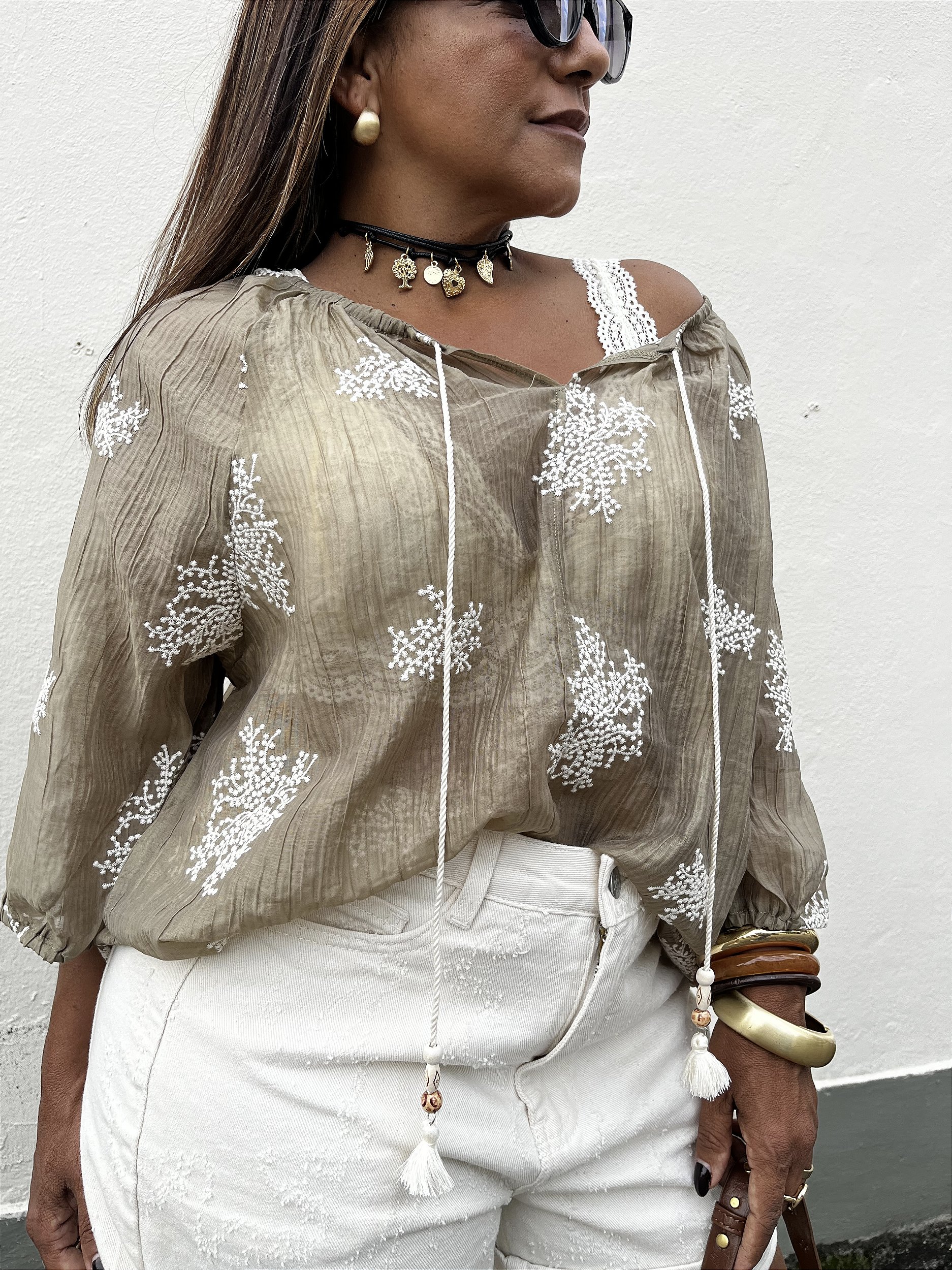 delicados, ela cria um visual feminino e elegante na medida certa. O elástico nas mangas