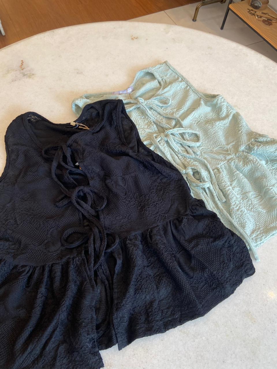 Blusa em malha trabalhada, com fechamento frontal por laços e detalhe de babado na barra,