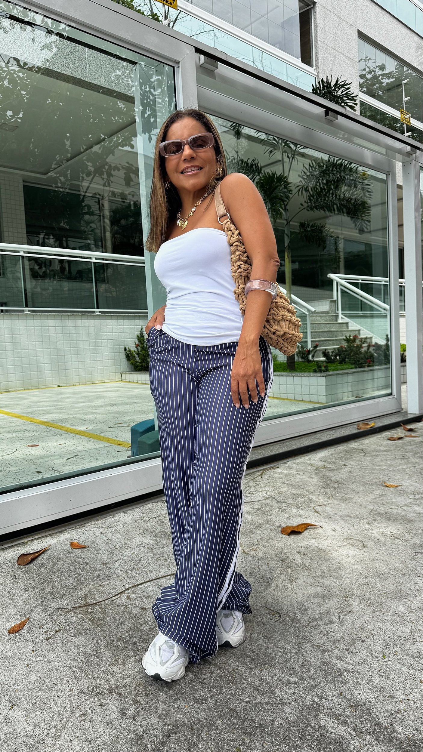 Malha fluit, cós de elástico e bolso faca. Versátil para looks elegantes ou casuais. Tamanhos P/M/G