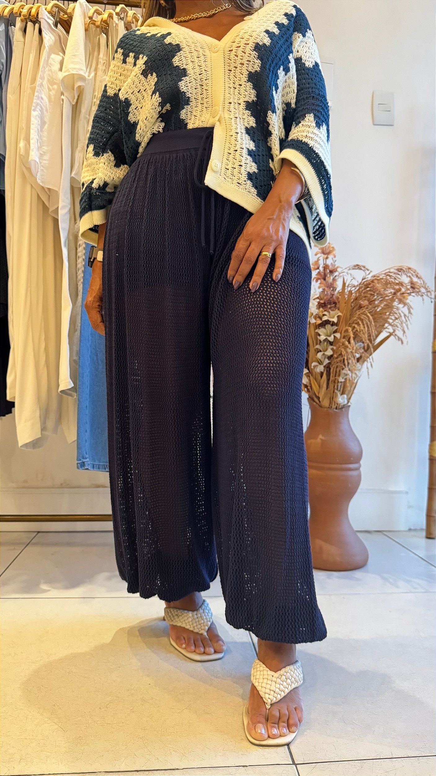 A Calça Tricô Aladim é leve, moderna e confortável. Com modelagem soltinha, cós ajustável com amarração e tricô vazado, traz um toque sofisticado e fresh. O short interno garante praticidade e segurança, tornando a peça perfeita para produções de verão, praia e também urbana com um toque fashion.