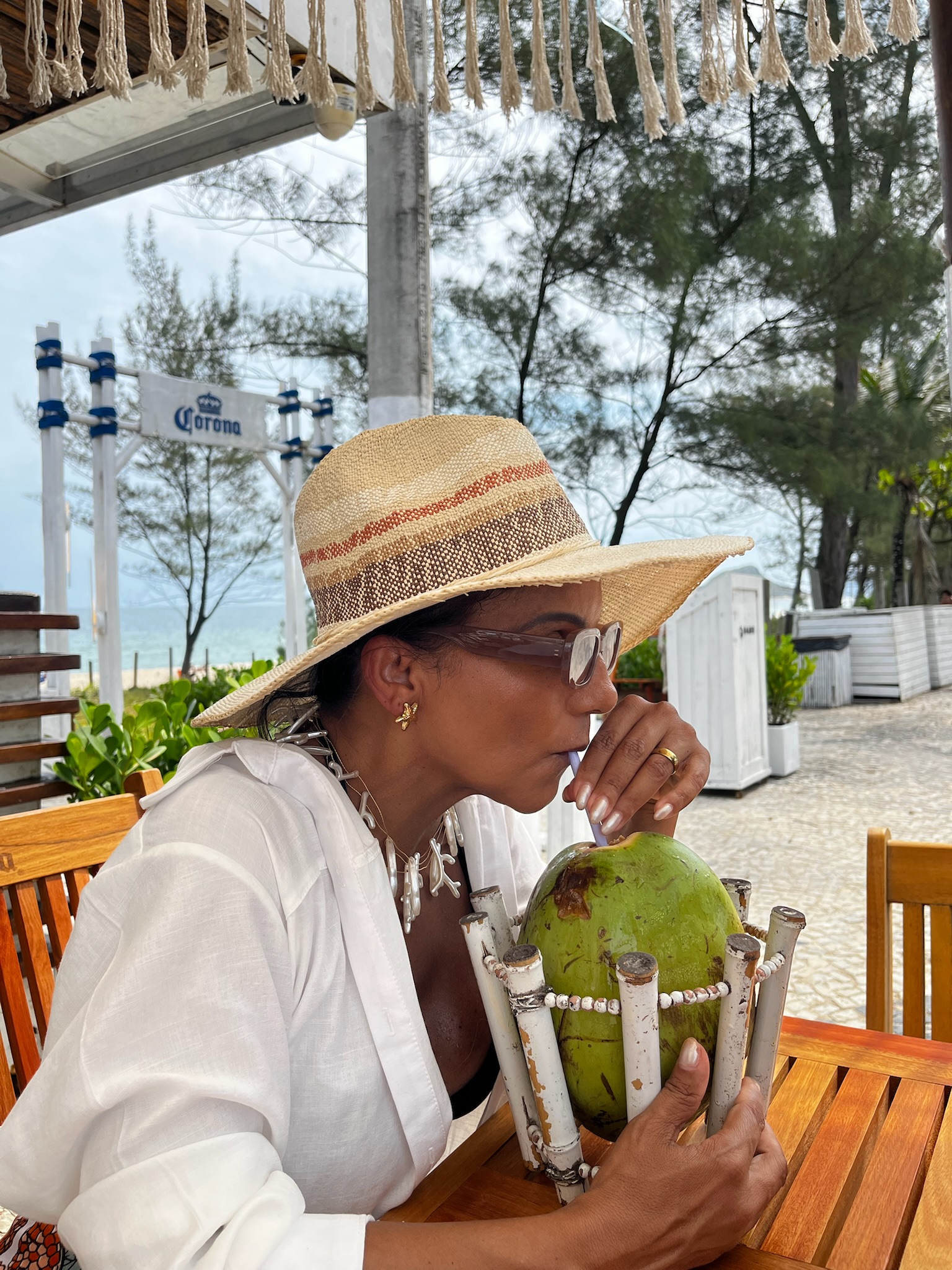 Chapéu em palha com acabamento artesanal, perfeito para compor looks de praia e produção urbanas com mood natural.