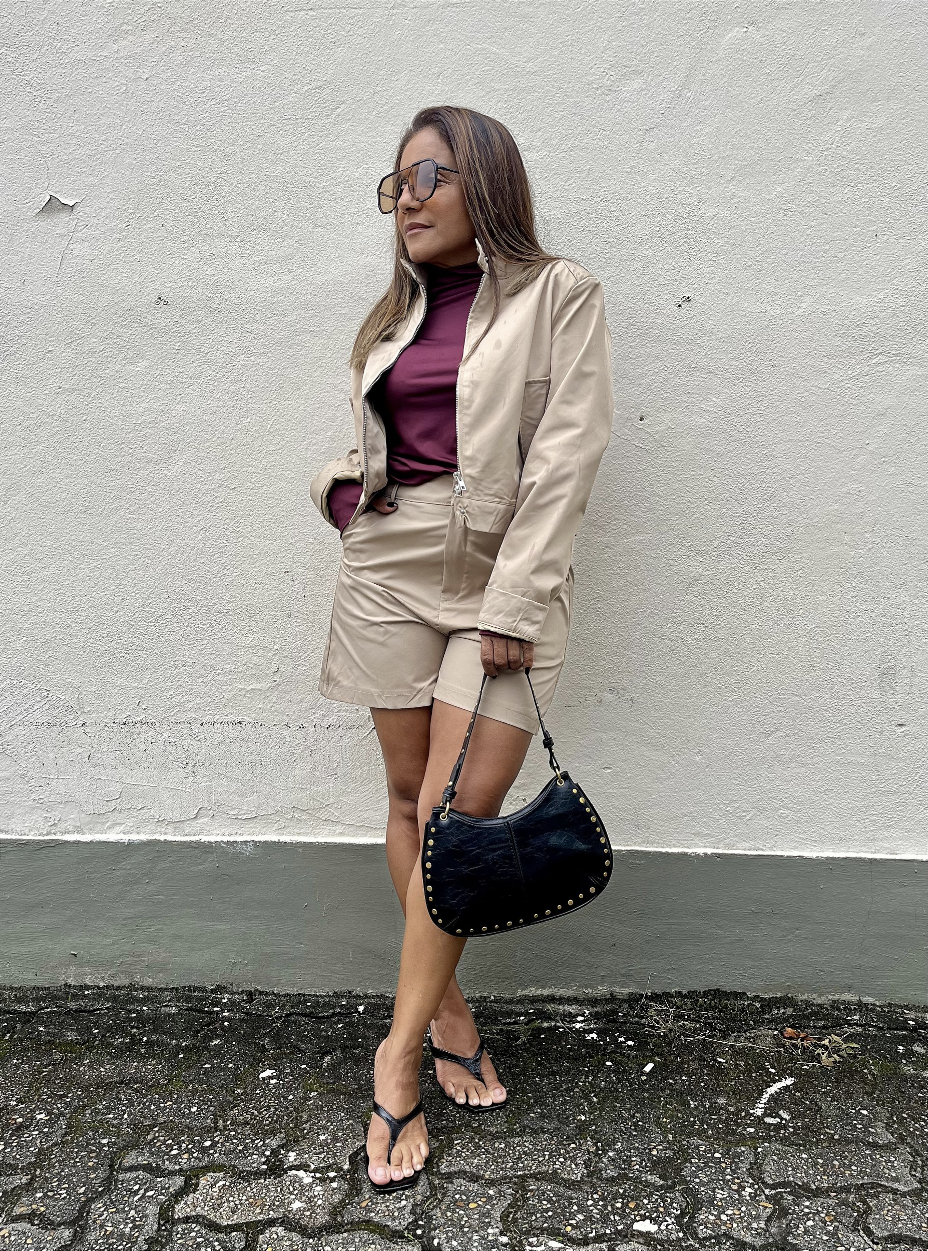 gola permitindo uso com gola alta, trazendo modernidade. O short tem bolso faca, corte de