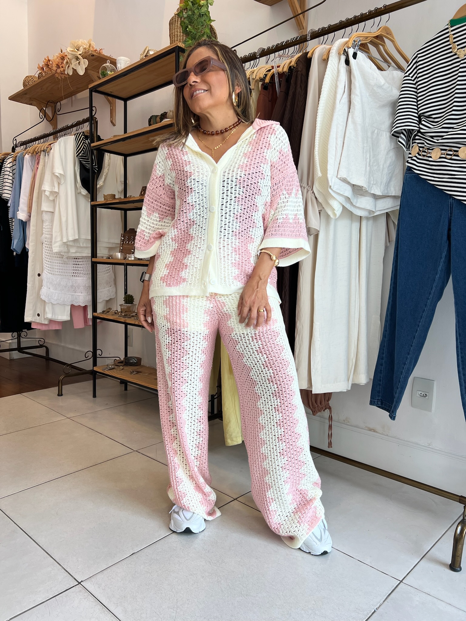 Conjunto Maya em tricô diferenciado, composto por camisa com botões forrados que pode ser usada aberta ou fechada, e calça com forro em short. Uma peça estilosa e versátil.