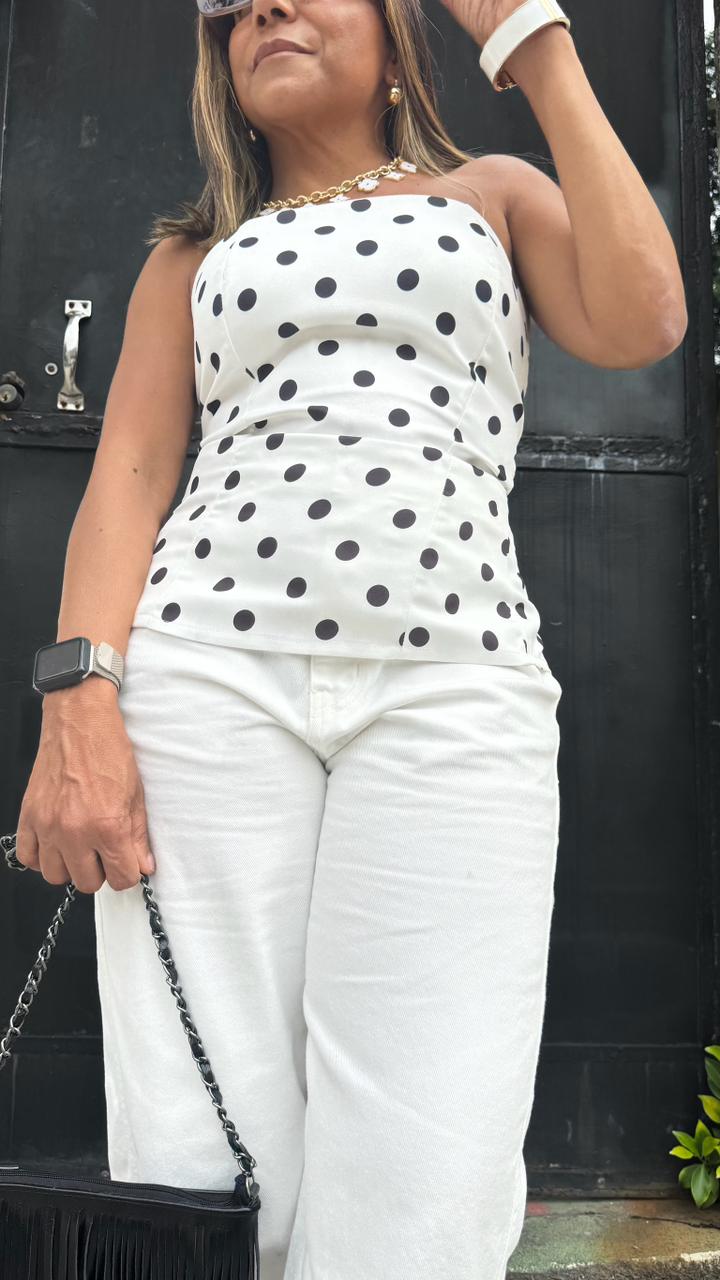 Blusa tomara que caia estampada em poá, estruturada e elegante.