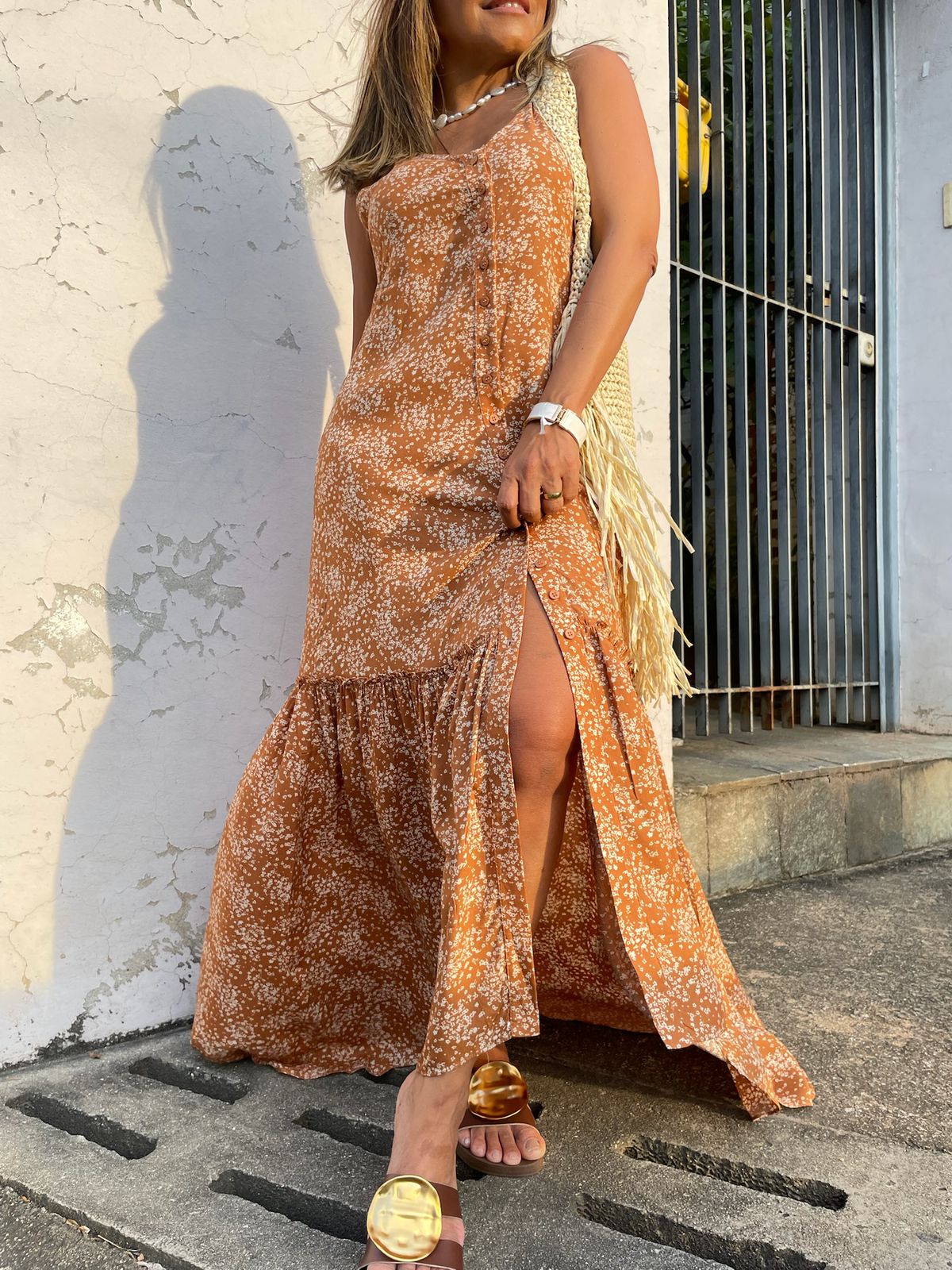 O Vestido Midi Floral é a escolha perfeita para quem busca elegância e conforto. Com tecido fluido que garante movimento, ele traz botões frontais até a altura do babado e tiras versáteis que permitem diferentes formas de amarração, valorizando a cintura. O corte mais alongado na parte de trás deixa o look sofisticado e moderno. Pode ser usado tanto com rasteiras em produções casuais quanto com salto em ocasiões mais elegantes.